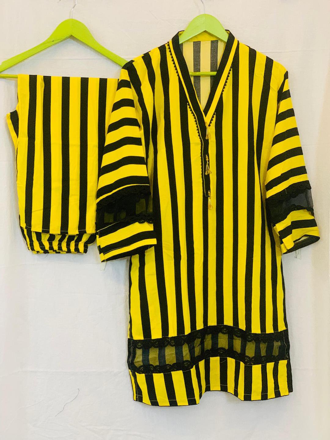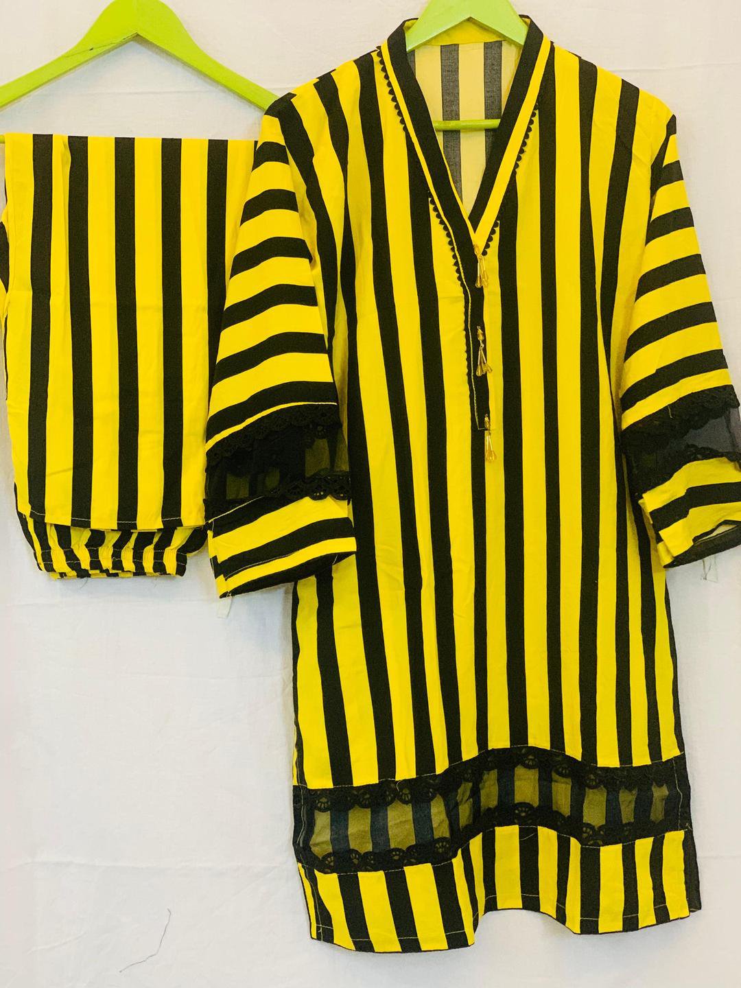 Discover Husnezara’s yellow 2-piece stitched linen suit for women. Printed V-neck shirt with matching trouser – lightweight, stylish, and perfect for everyday wear.