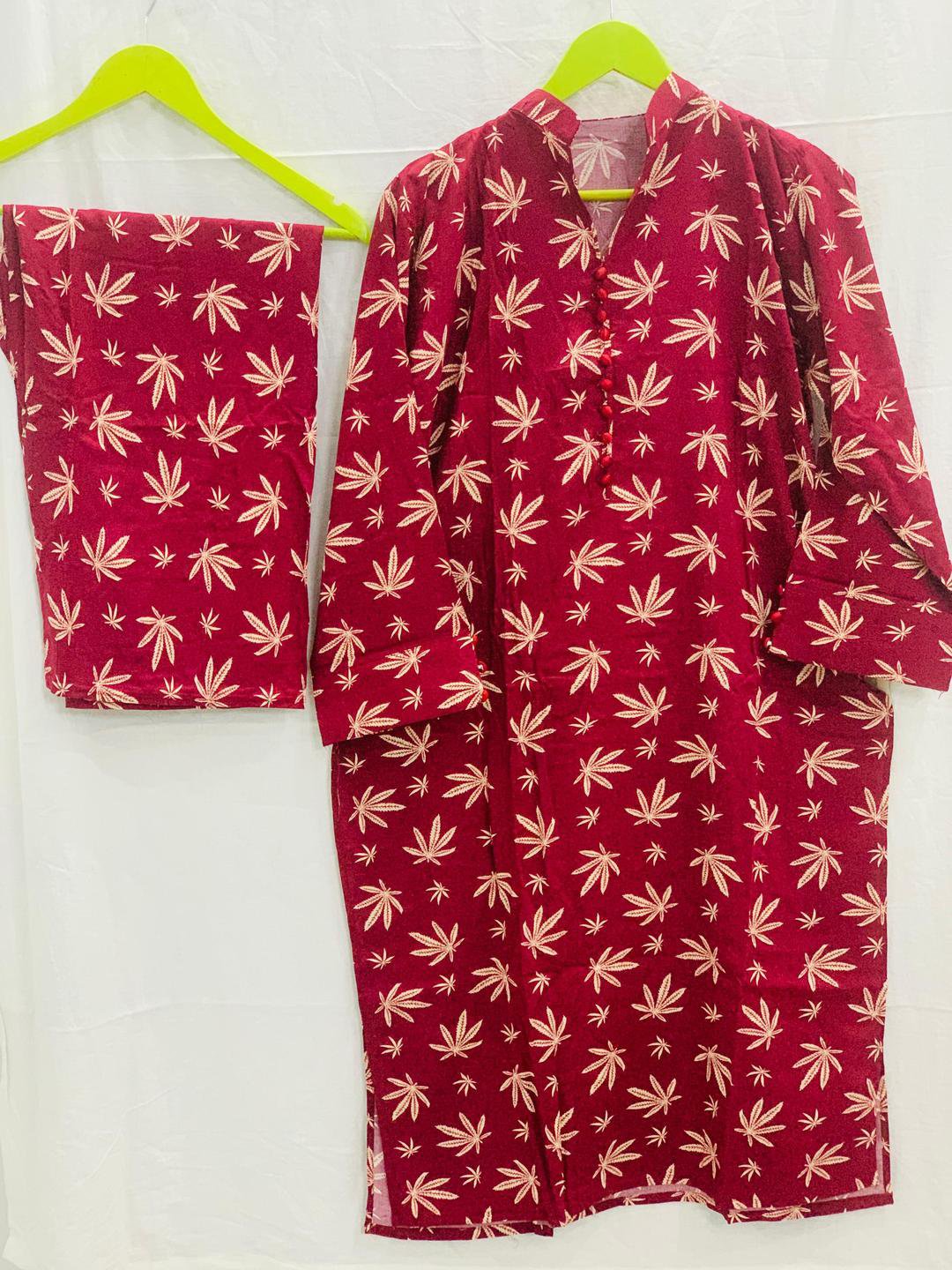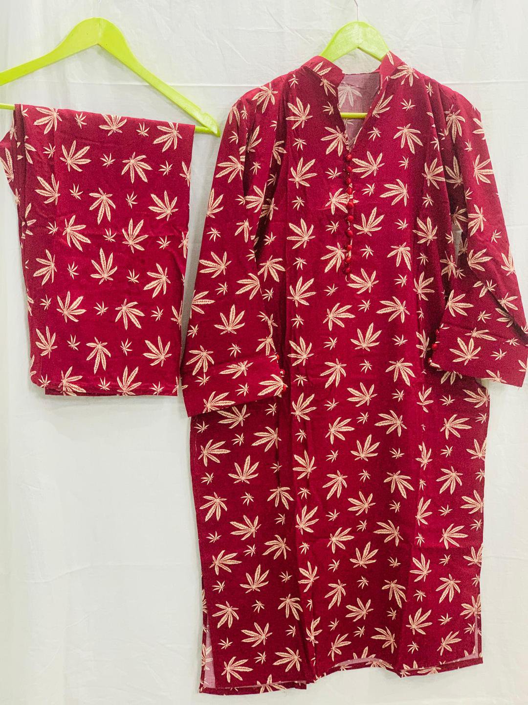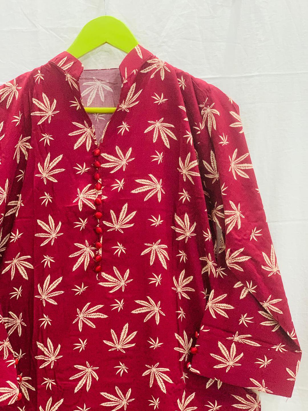 Be the first to review “2 Pcs Women’s Maroon Linen Suit | Stitched Printed Shirt and Trouser Set – Husnezara”