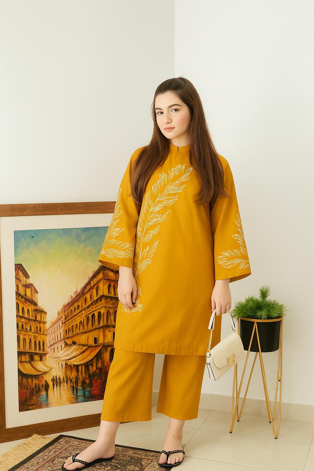 Explore Husnezara’s mustard cotton 2-piece co-ord set with elegant white embroidery on the front and sleeves. High neck shirt and plain trousers for a trendy yet graceful everyday style.