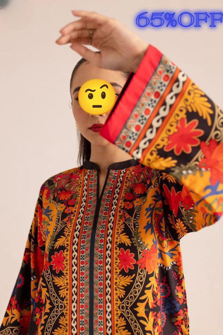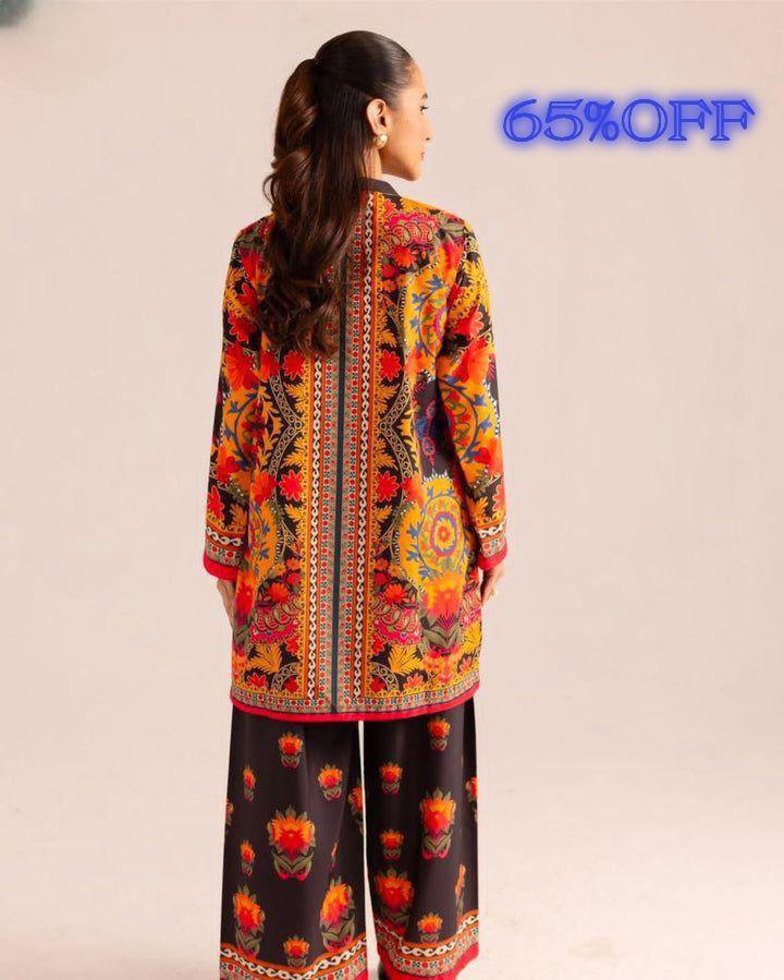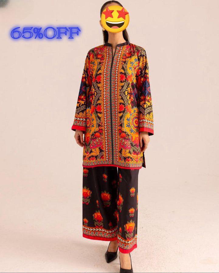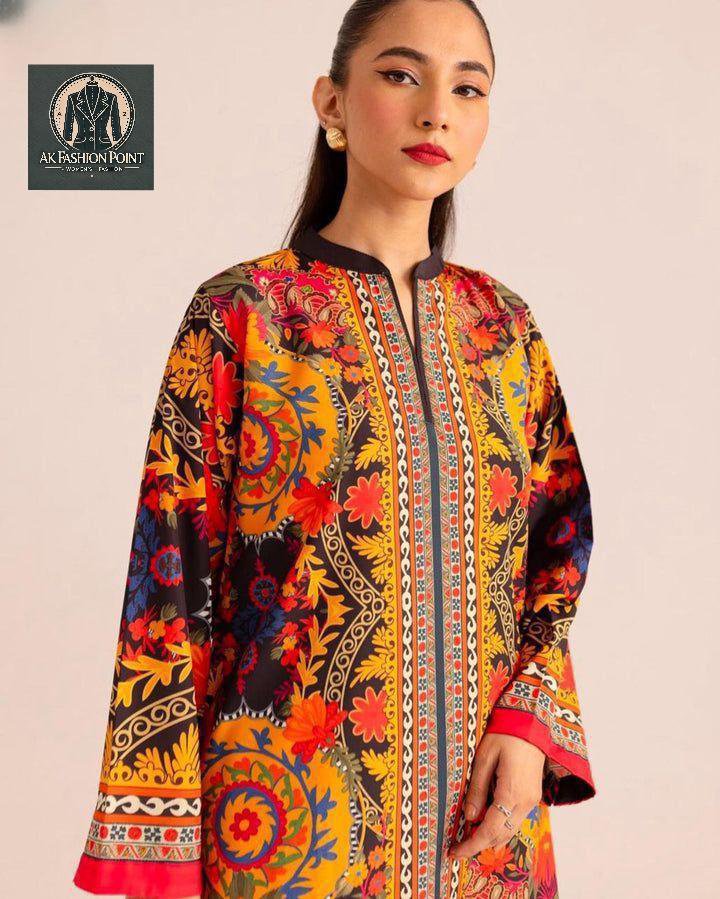 Shop Husnezara’s 2-piece stitched Swiss lawn suit in vibrant orange. Featuring a printed shirt and matching trousers, this set is perfect for casual elegance. Available in Large size.